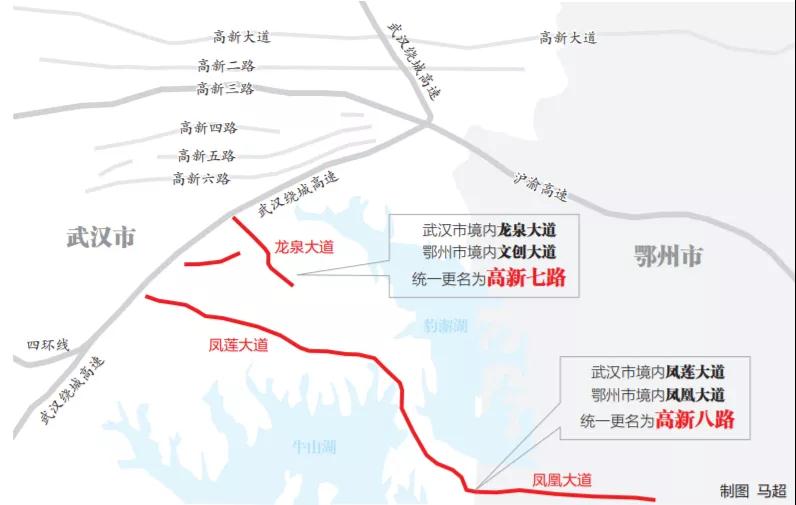 此次对接,双方明确,将武汉市境内的龙泉大道、鄂州市境内的文创大道统一更名为高新七路,将武汉市境内凤莲大道、鄂州市境内凤凰大道统一更名为高新八路。